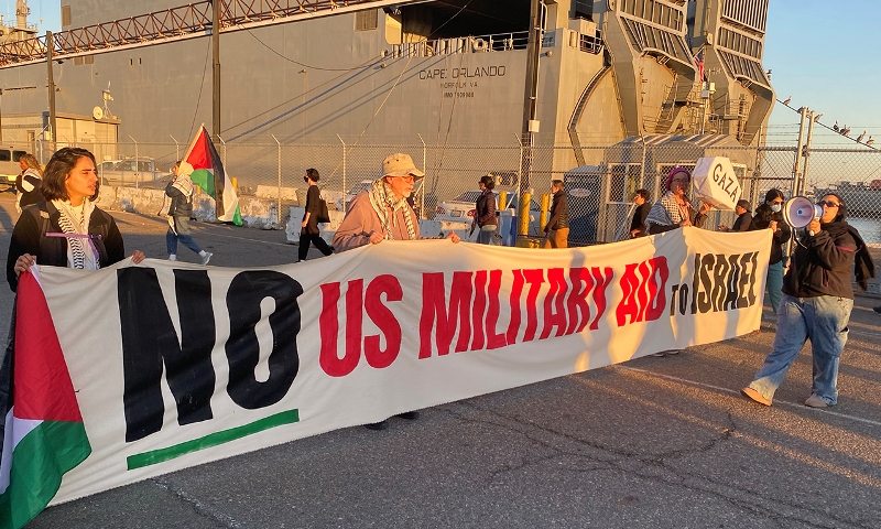 Arab Resource and Organizing Center held the demonstration at the California port. AROC press coordinator Wassim Hage in a statement said, “We’re sending the alarm that the US government is, in fact, sending these weaponsto Israel.