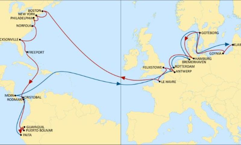 Paita (Peru) – Cristobal (Panama) – Moin (Costa Rica) – Antwerp (Belgium) – Rotterdam (Netherlands) – Bremerhaven (Germany) – Klaipeda (Lithuania) – Gdynia (Poland) – Gothenburg (Sweden) – Hamburg (Germany) – Antwerp (Belgium) – Felixstowe (United Kingdom) – Le Havre (France) – Boston (United States) – New York (United States) – Philadelphia (United States) – Norfolk (United States) – Jacksonville (United States) – Freeport (Bahamas) – Rodman (Panama) – Guayaquil (Ecuador) – Puerto Bolivar (Ecuador) – Guayaquil (Ecuador) – Paita
